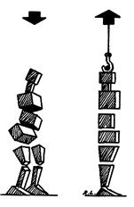 Nasze ciała, podobnie jak inne fizyczne struktury, reagują na działającą na nie stale siłę grawitacji. Kiedy nie jesteśmy w strukturalnej równowagi, grawitacja ciągnie nas w dół tak samo jak inne nieożywione przedmioty (np. domy, drzewa), kiedy tracą strukturalną integralność (rys.A). Podstawowy cel procesu terapeutycznego jakim jest Rolfing, to uwolnienie napięcia i odnalezienie równowagi poprzez ponowne ustawienie struktur ciała w polu grawitacji (rys. B, po prawej).
